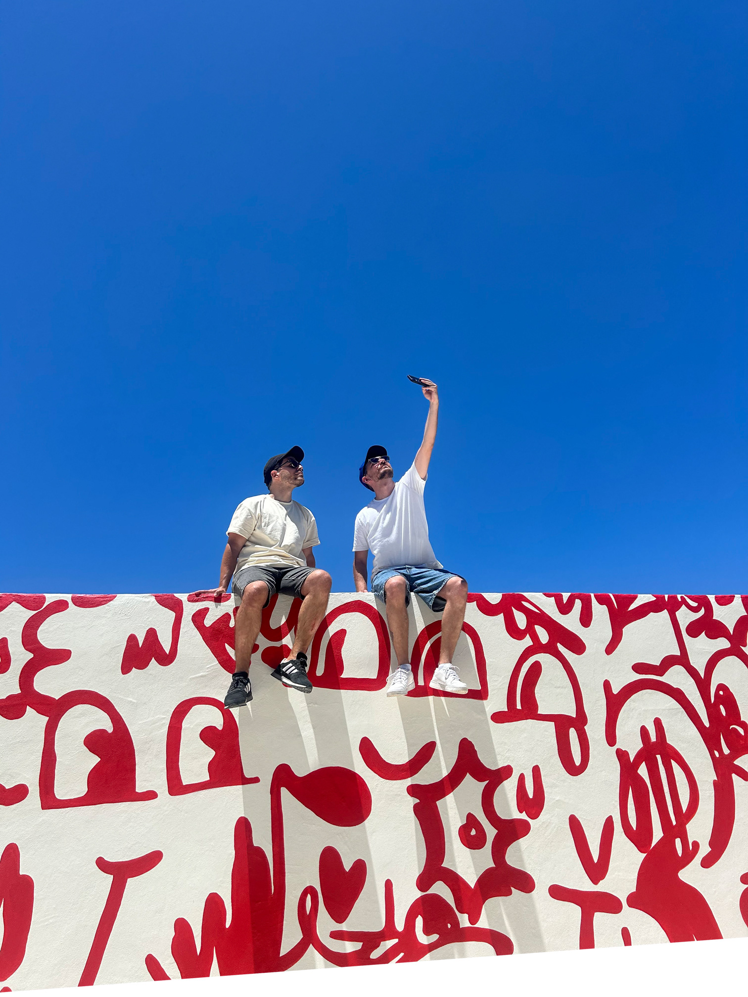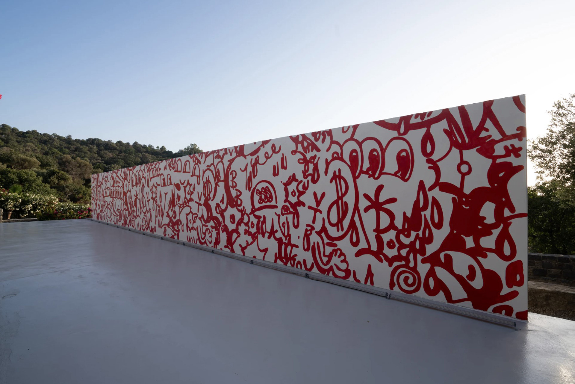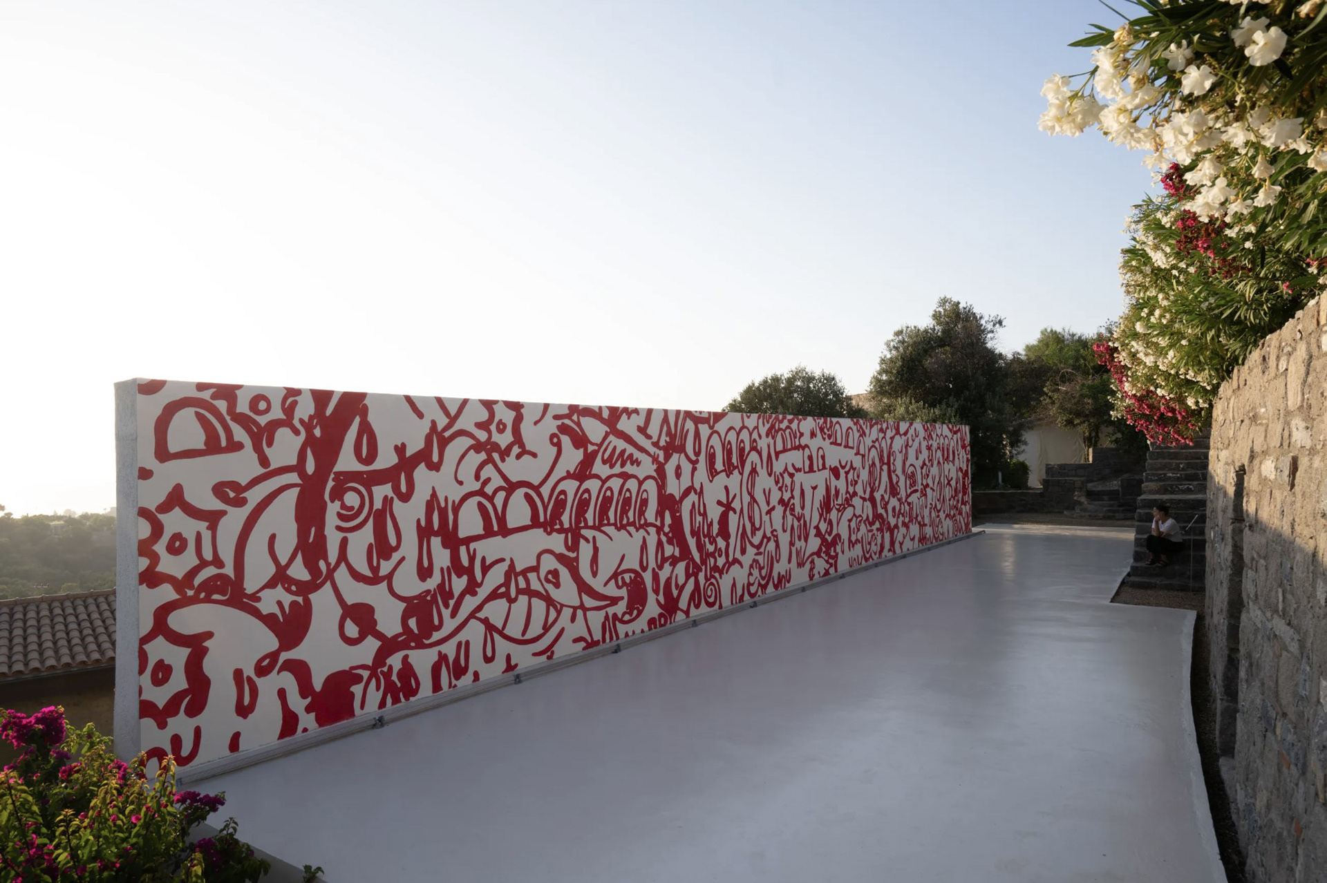 "Mural 3000 by Mehmet & Kazım located at PİLEVNELİ Yalıkavak. In Mural 3000, Mehmet & Kazım magnifies the characteristic Edding drawings impressively which are reminiscent of "throw-ups," a graffiti style that has shaped metropolises for over 50 years. Inspired by Francisco Goya's "Pinturas Negras," abstract expressionists from the 1950s, Paul Klee's "Geschwister," Pierre Soulages' works, and modern scenes from Brooklyn's Bushwick, Mehmet & Kazım's unique visual language captures the urban life scene and emotions. Infusing all their iconography with various symbols and impressions from New York streets, the duo brings New York's vibrant street language to Bodrum, this time in red."