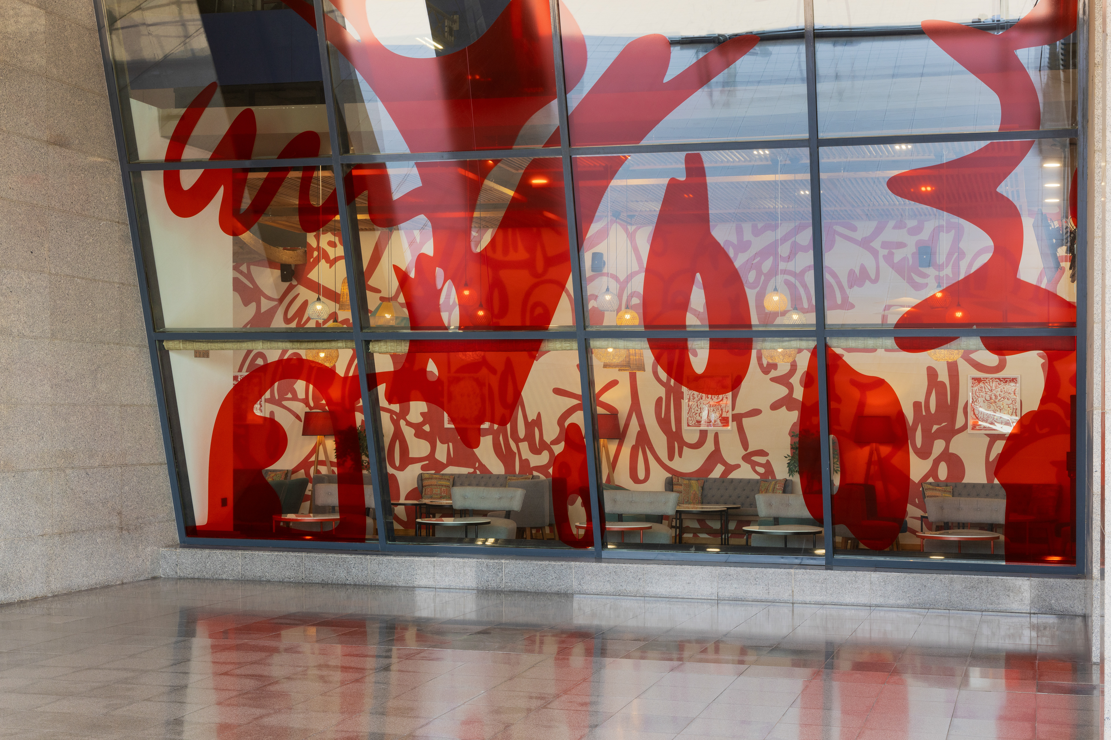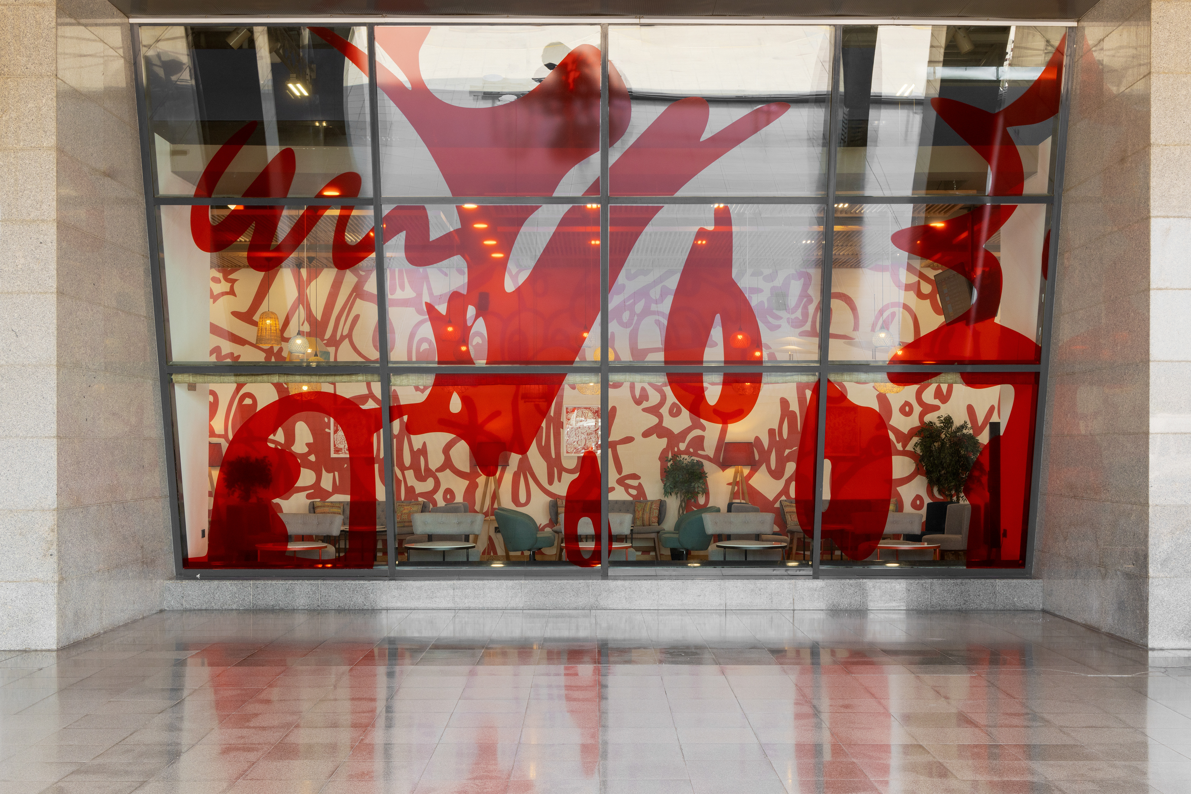 The installation, named Edding 3000, is comprised of three distinct elements. It includes wallpaper inspired by the streets and walls of metropolises, a custom design applied to glass, and ten unique prints created specifically for the installation by Mehmet & Kazım. Despite the abstract nature of the artwork, Edding 3000 captures the recognizable language and excitement of the street.