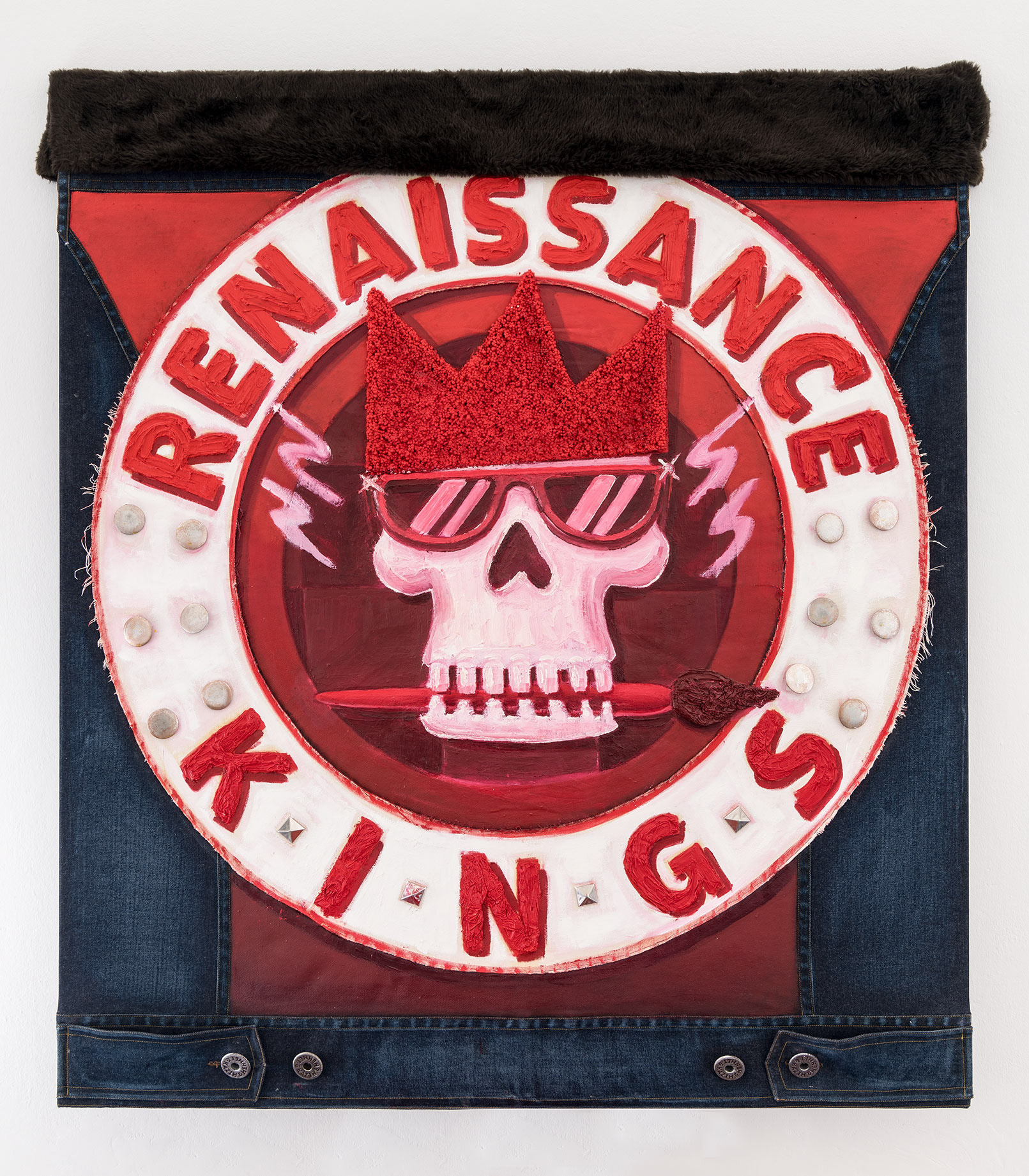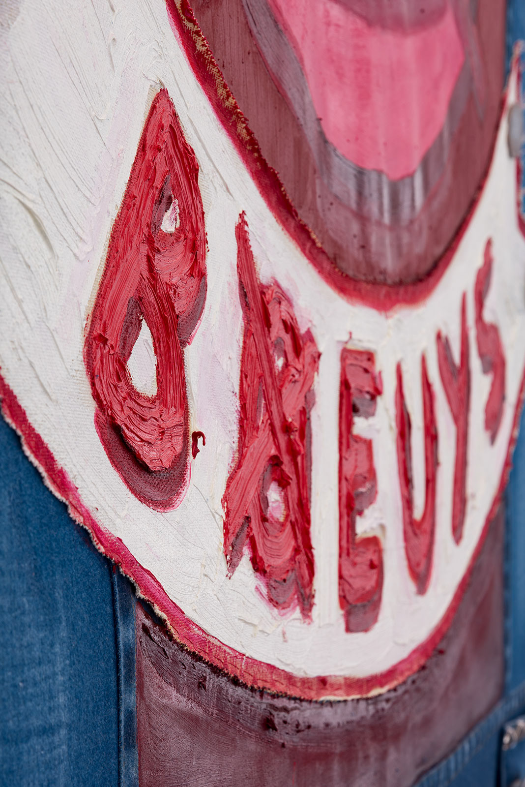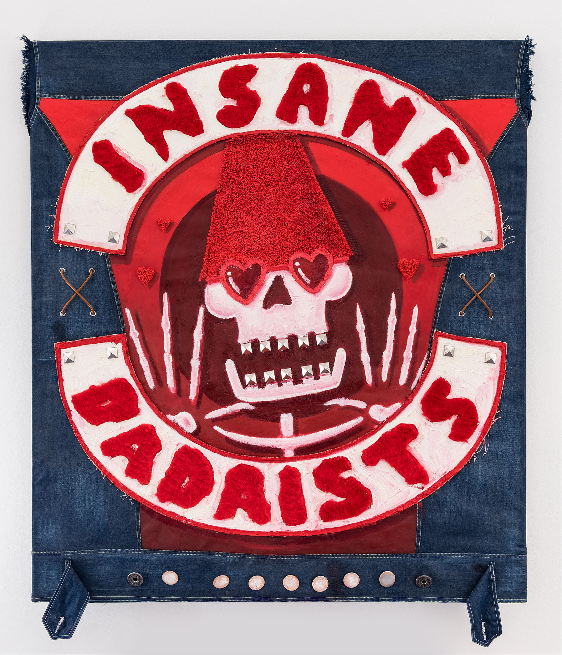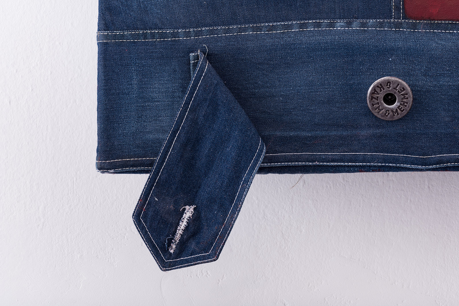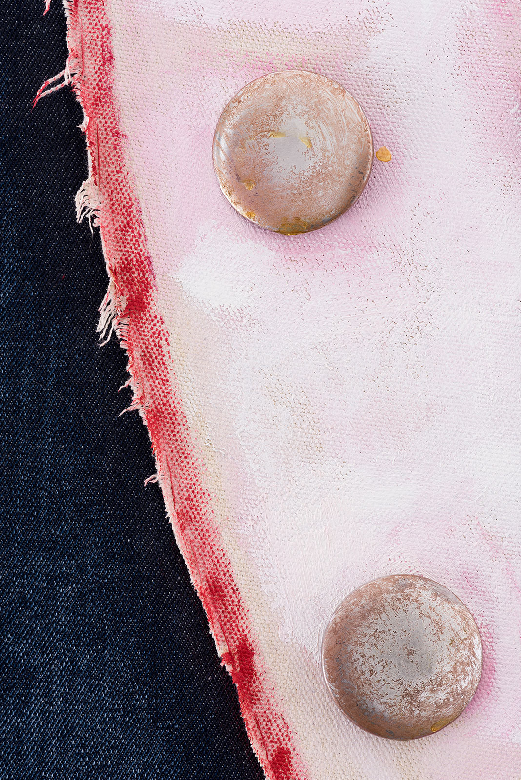 150 x 170 cm / 2018 / Oil on custom made denim combined with 3d printed buttons and rivets