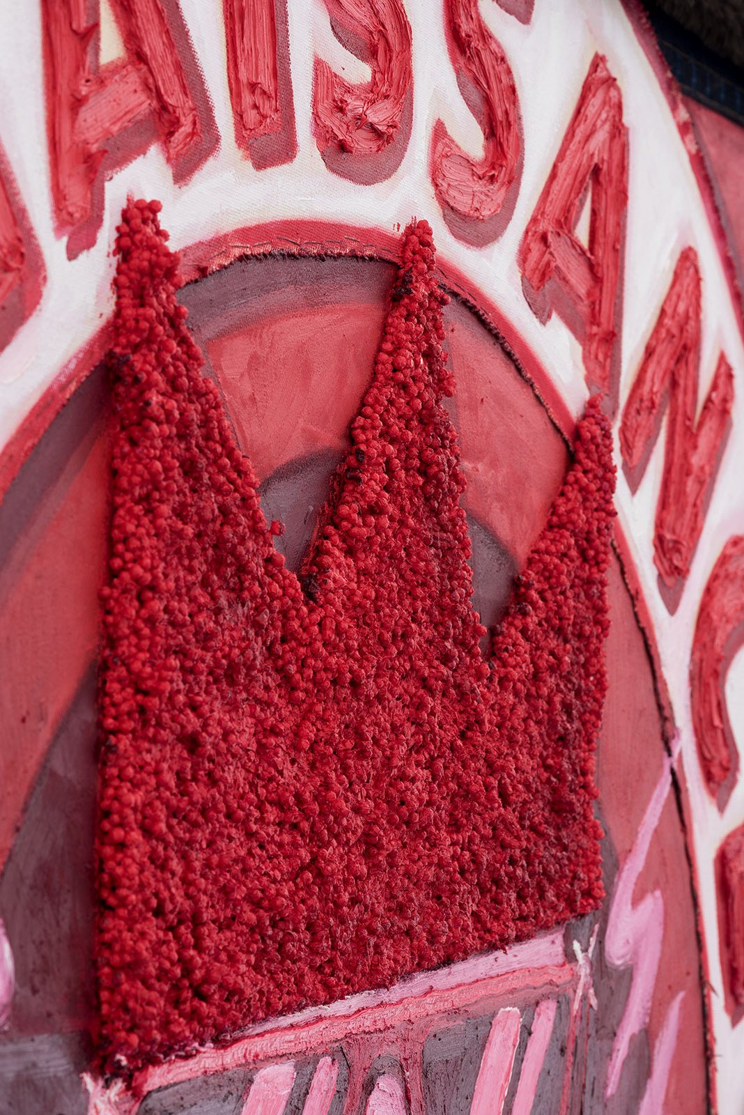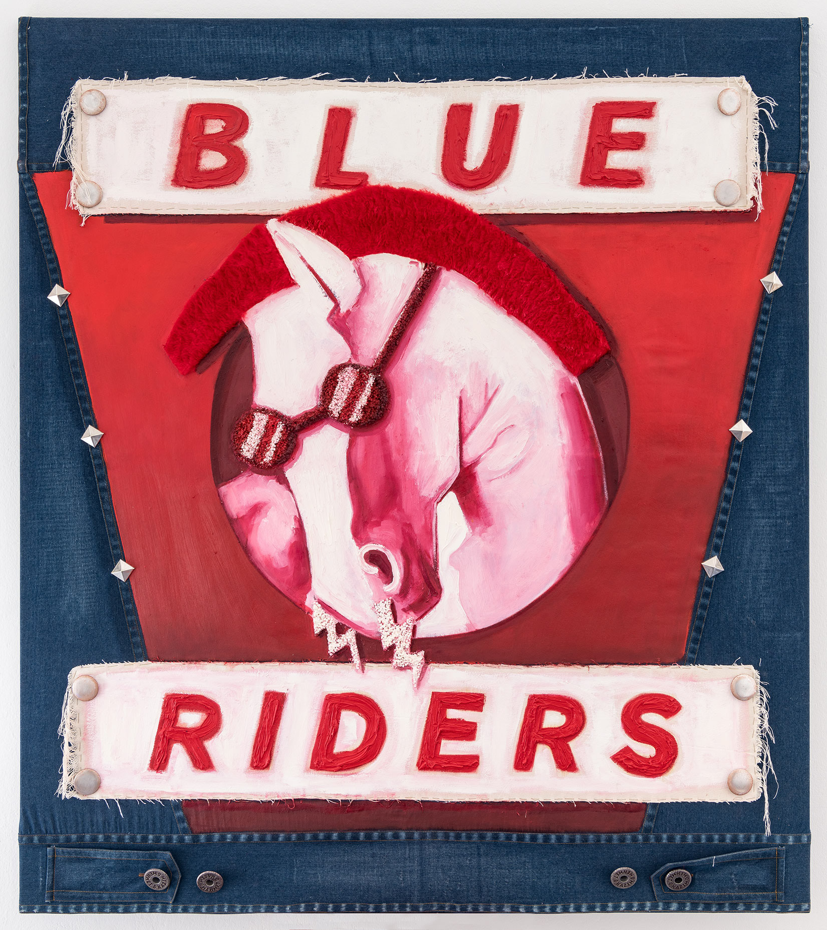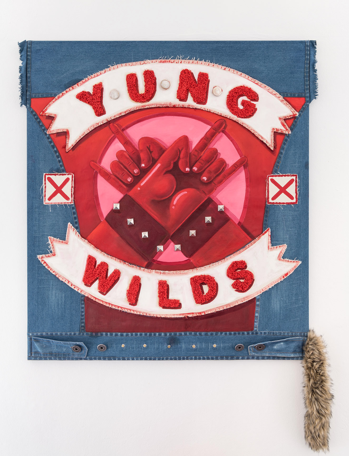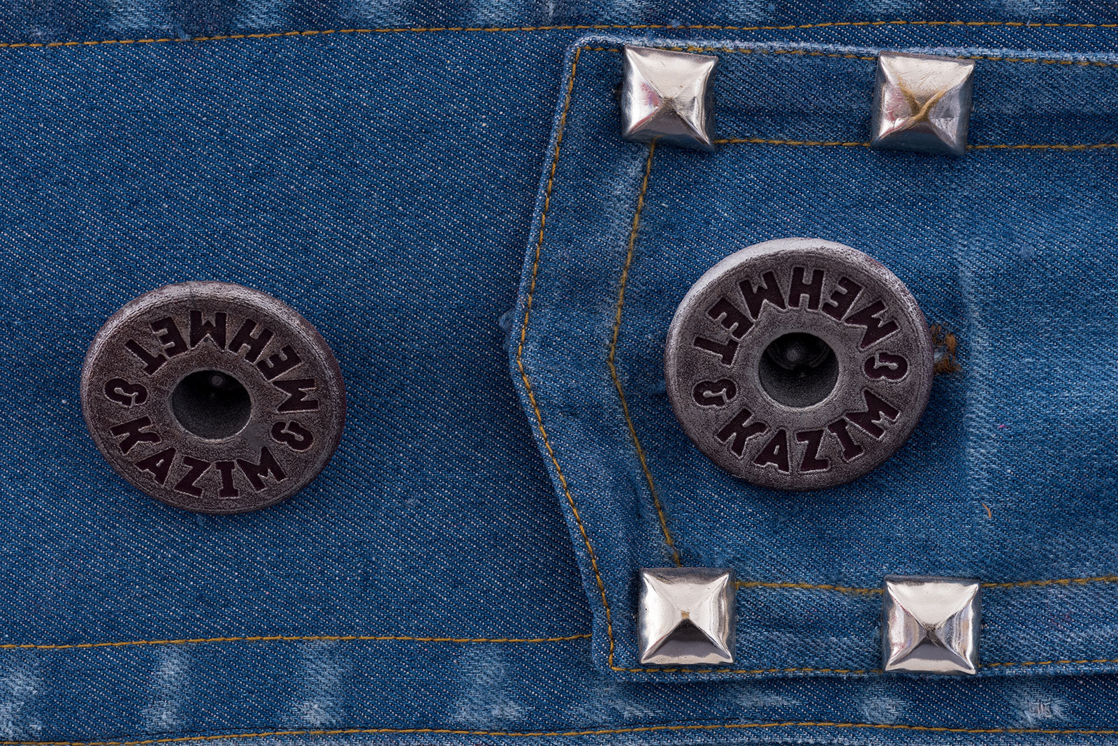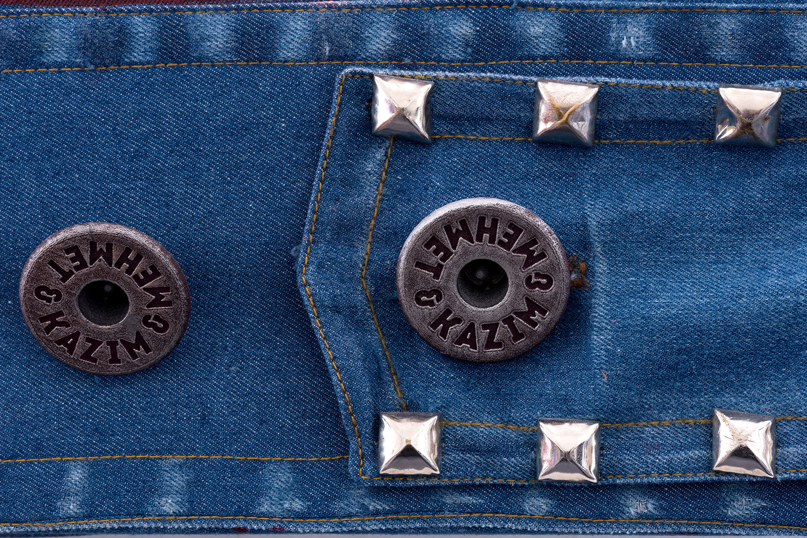 150 x 170 cm / 2018 / Oil on custom made denim combined with 3d printed buttons and rivets