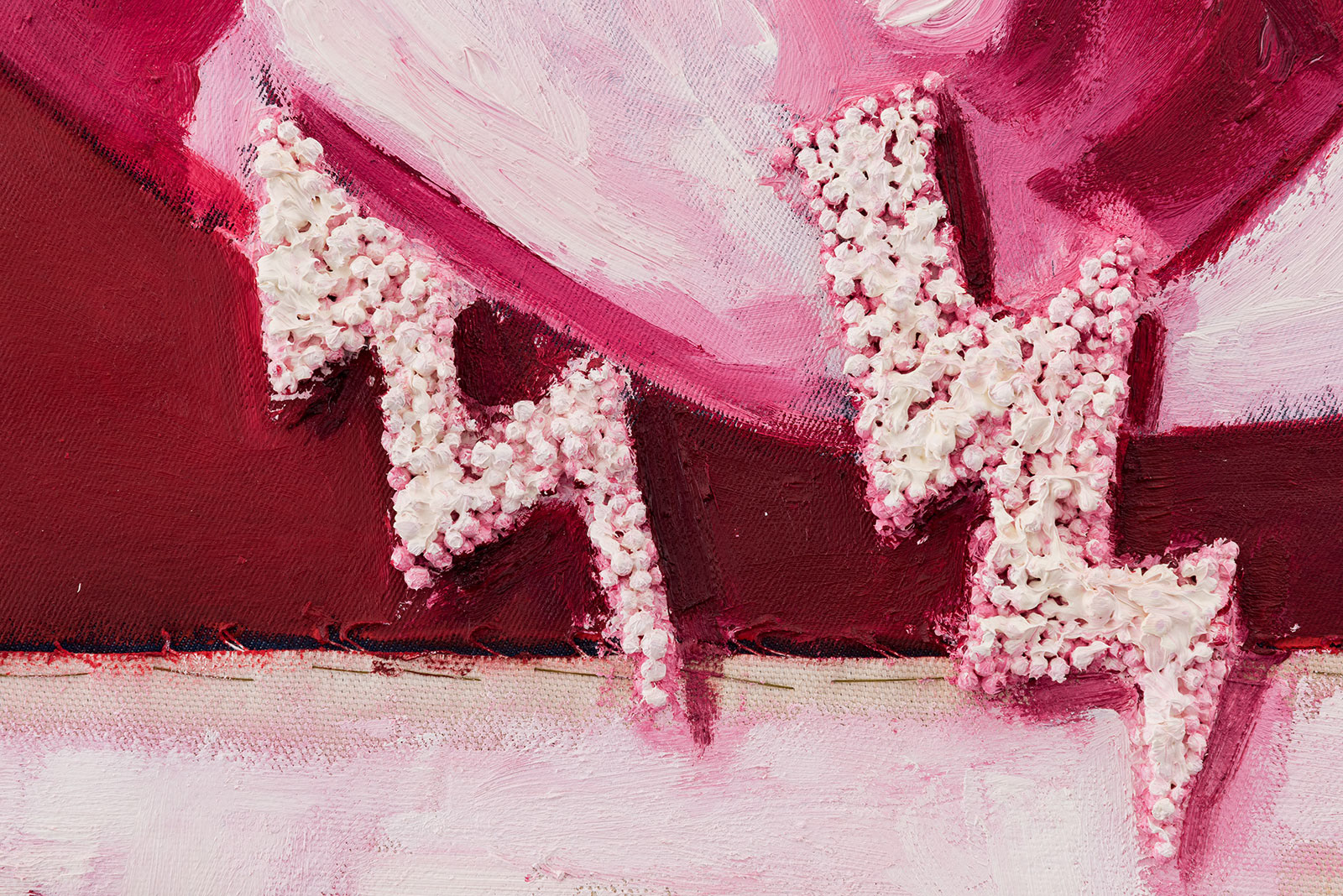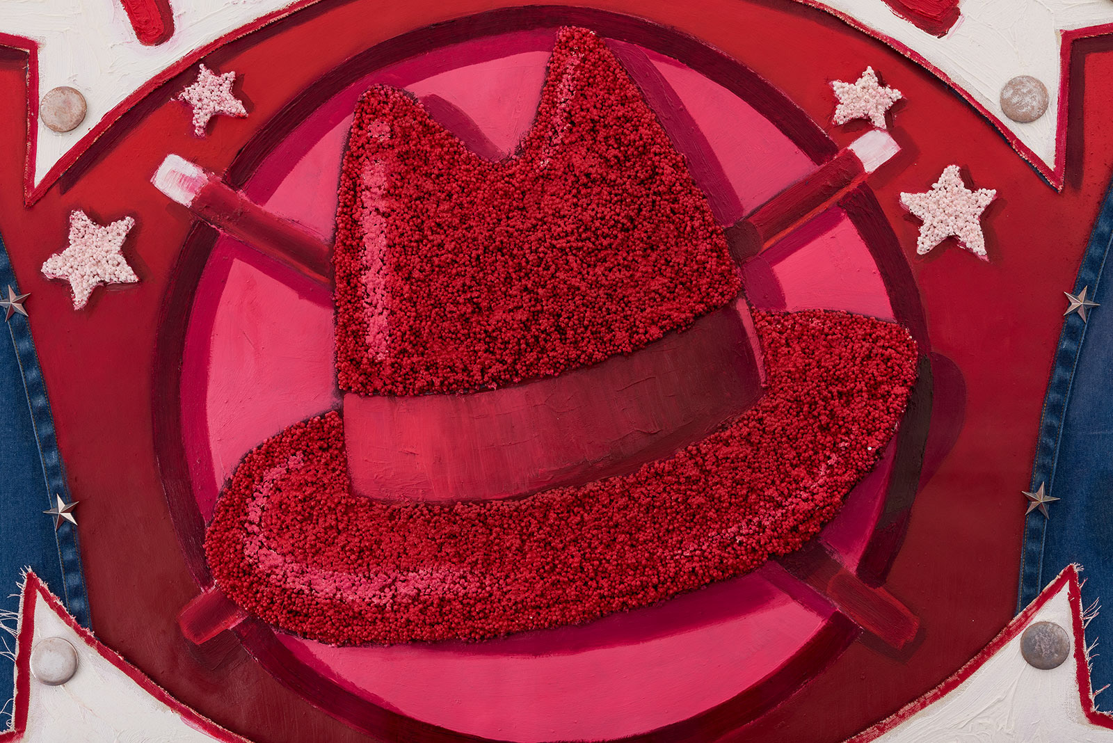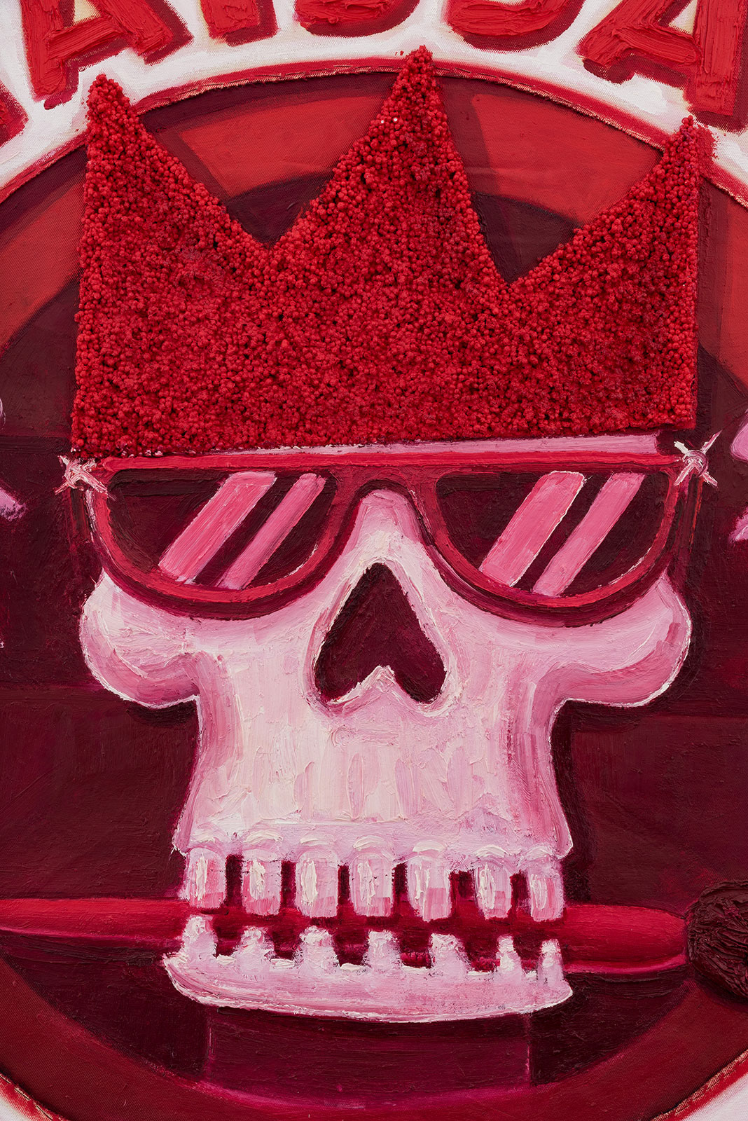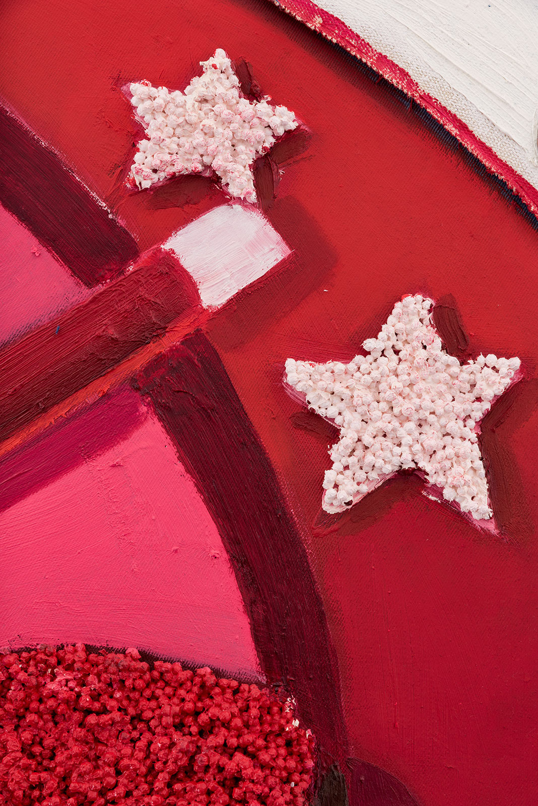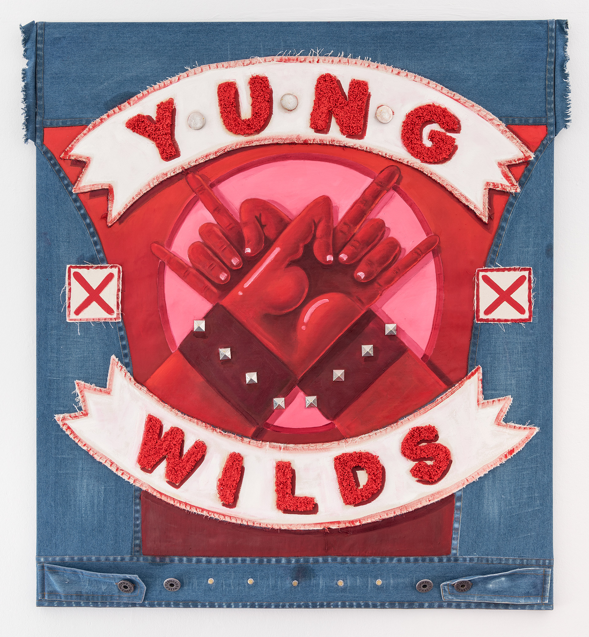150 x 170 cm / 2018 / Oil on custom made denim combined with 3d printed buttons and rivets
