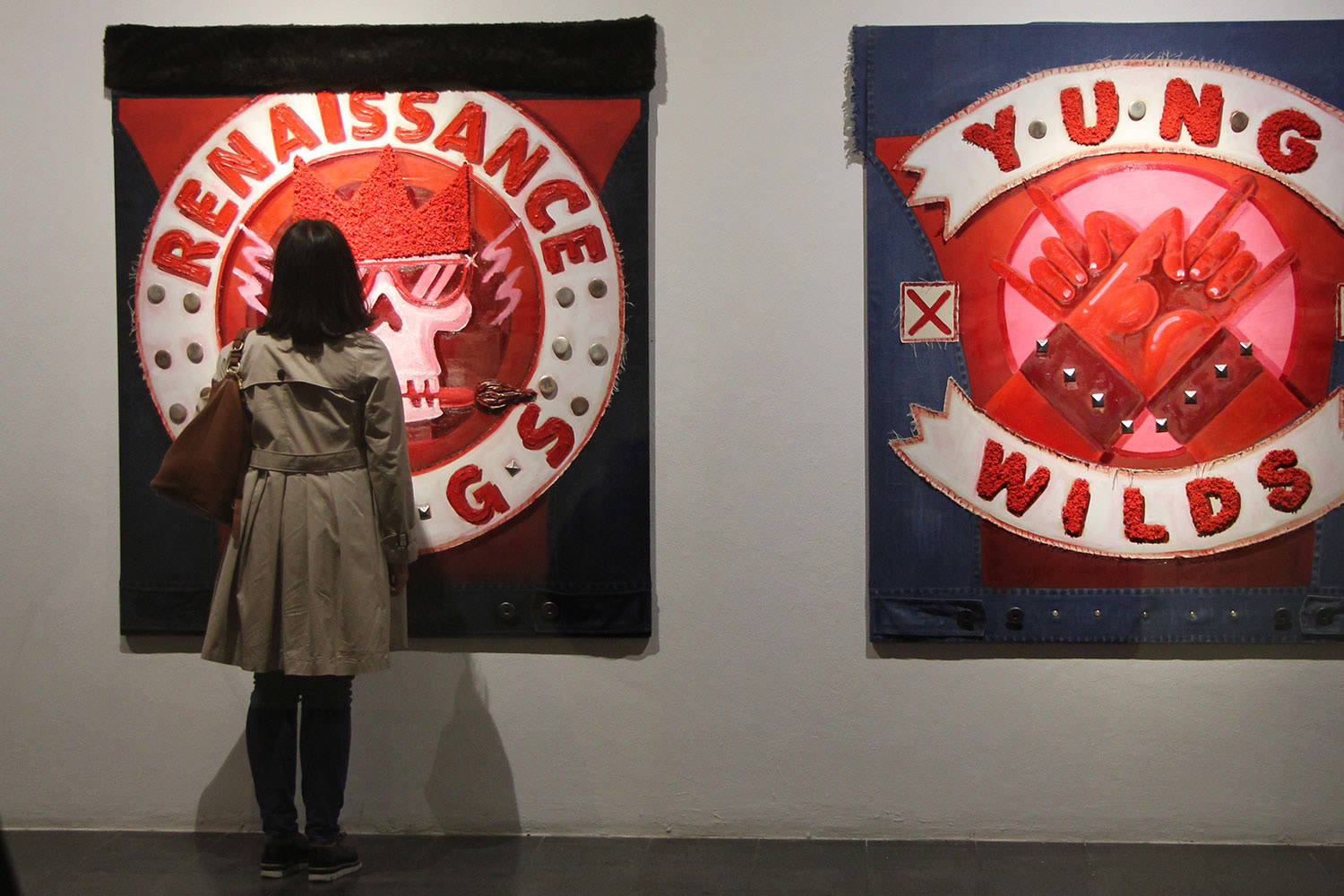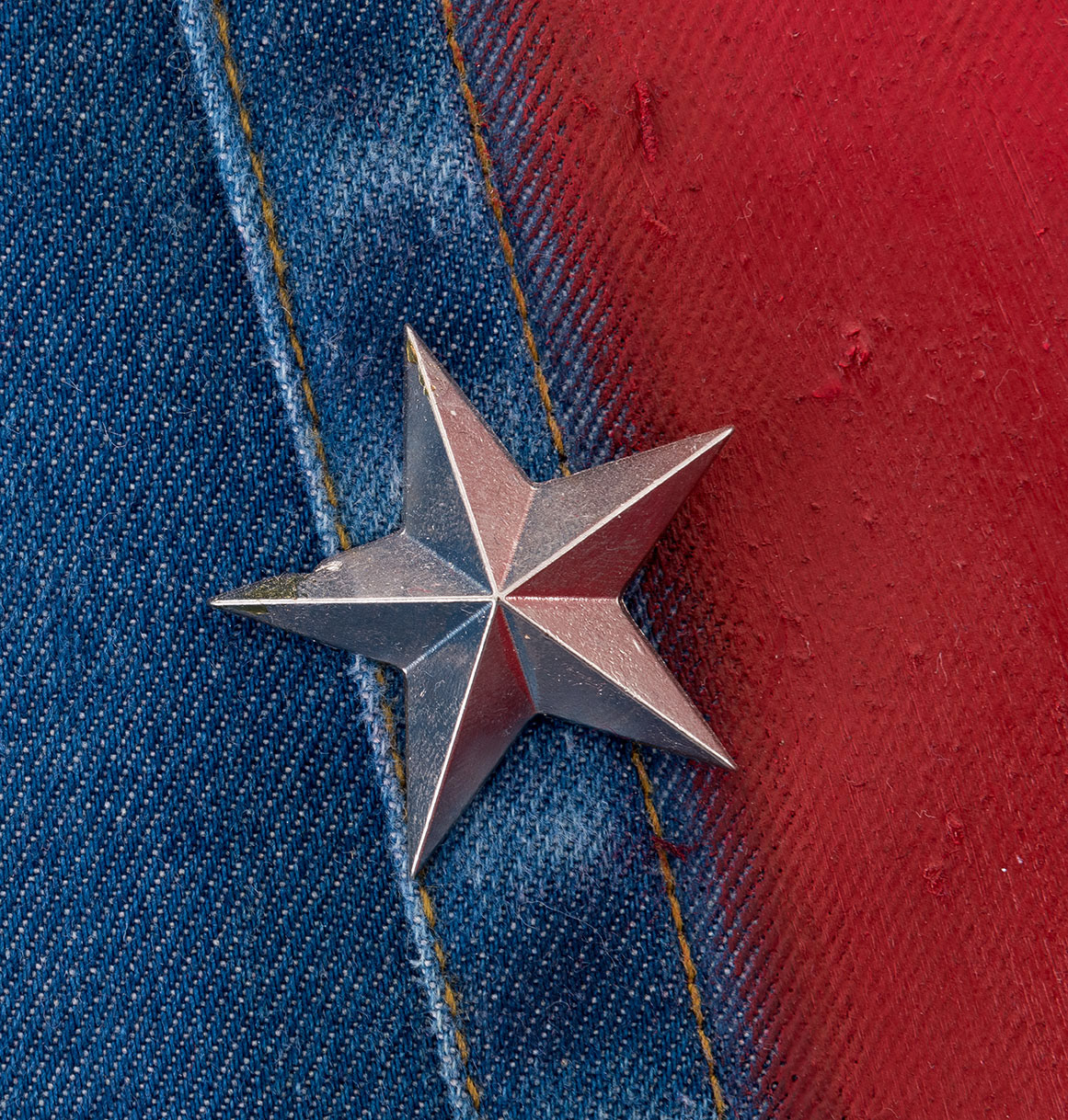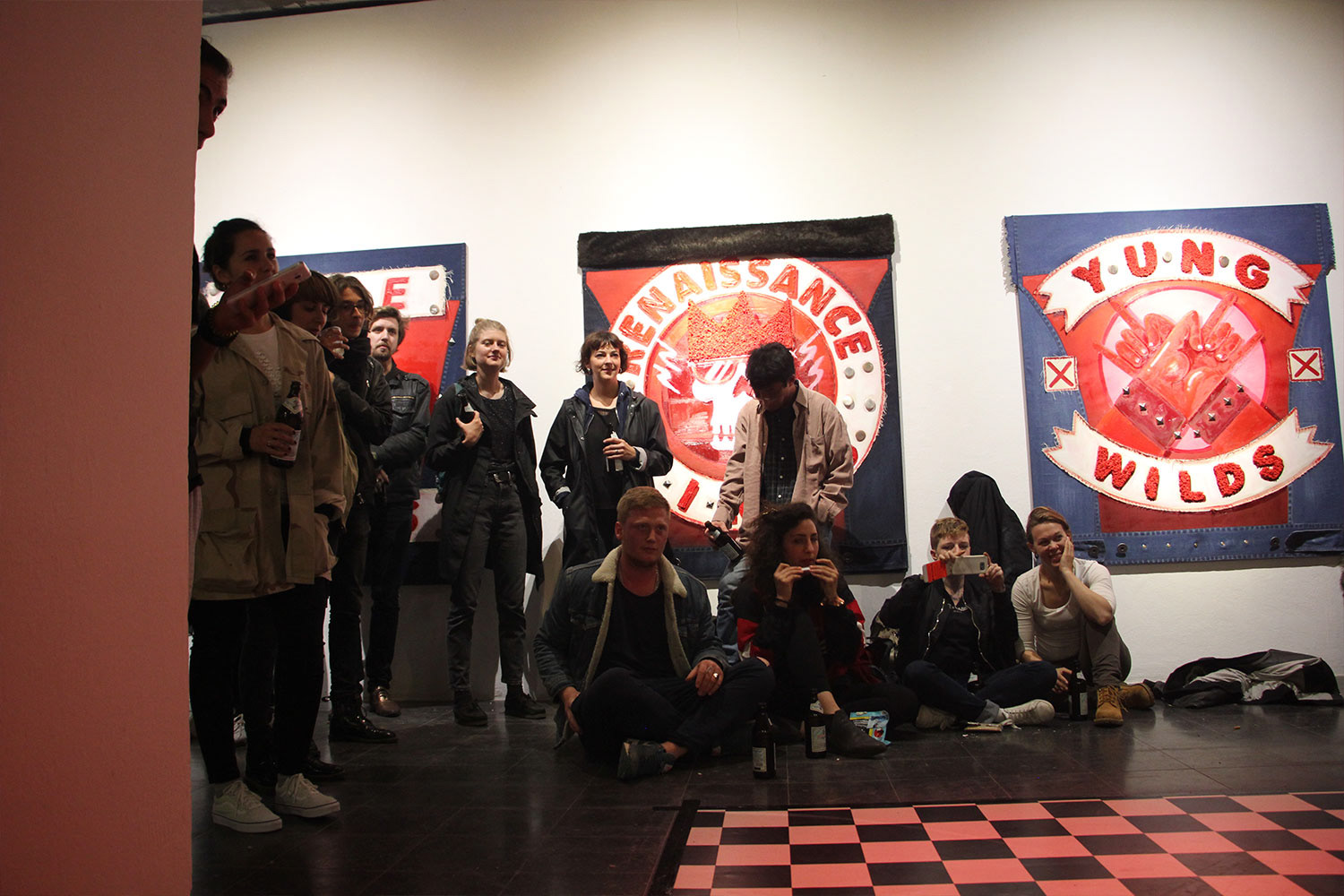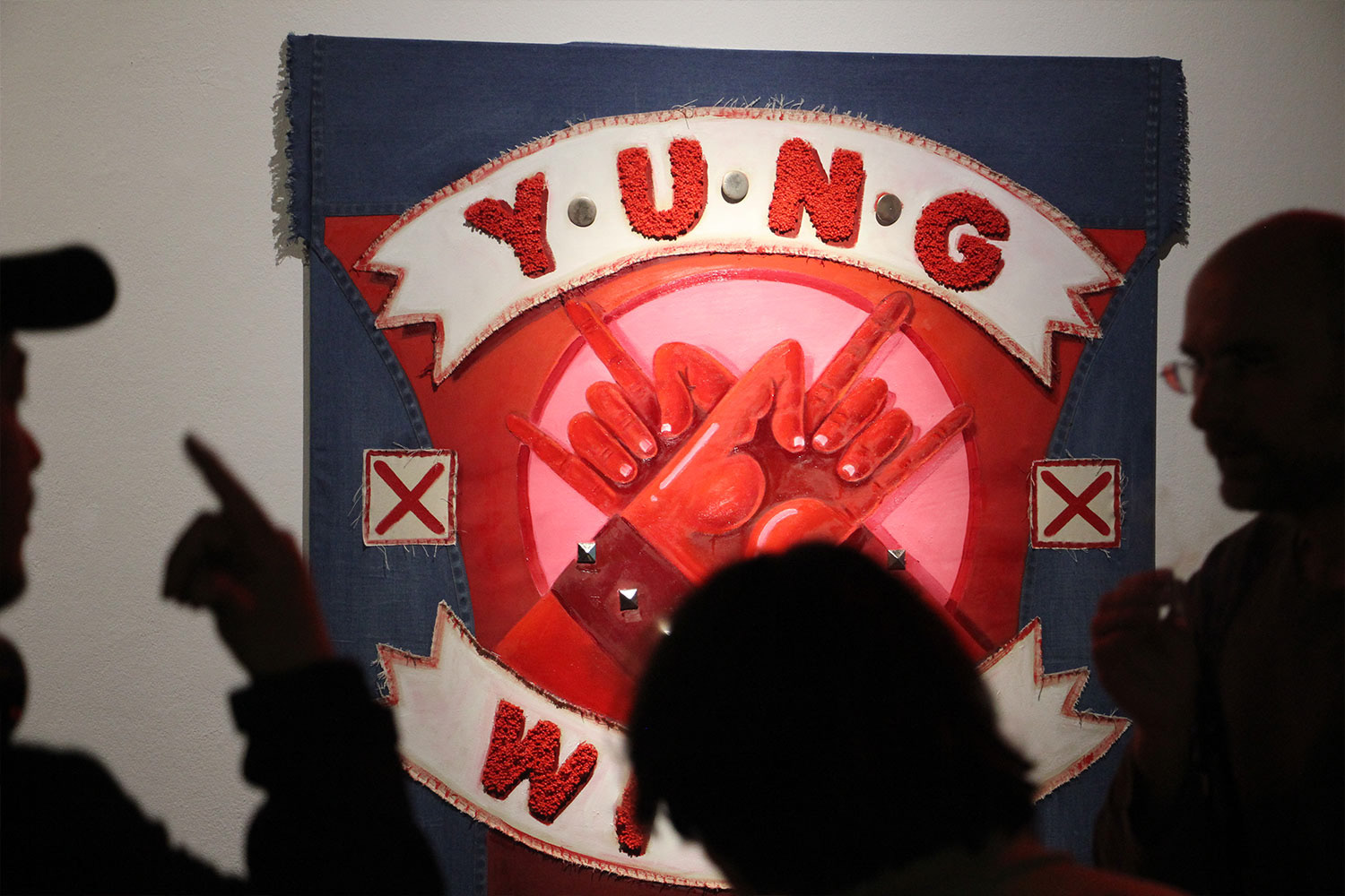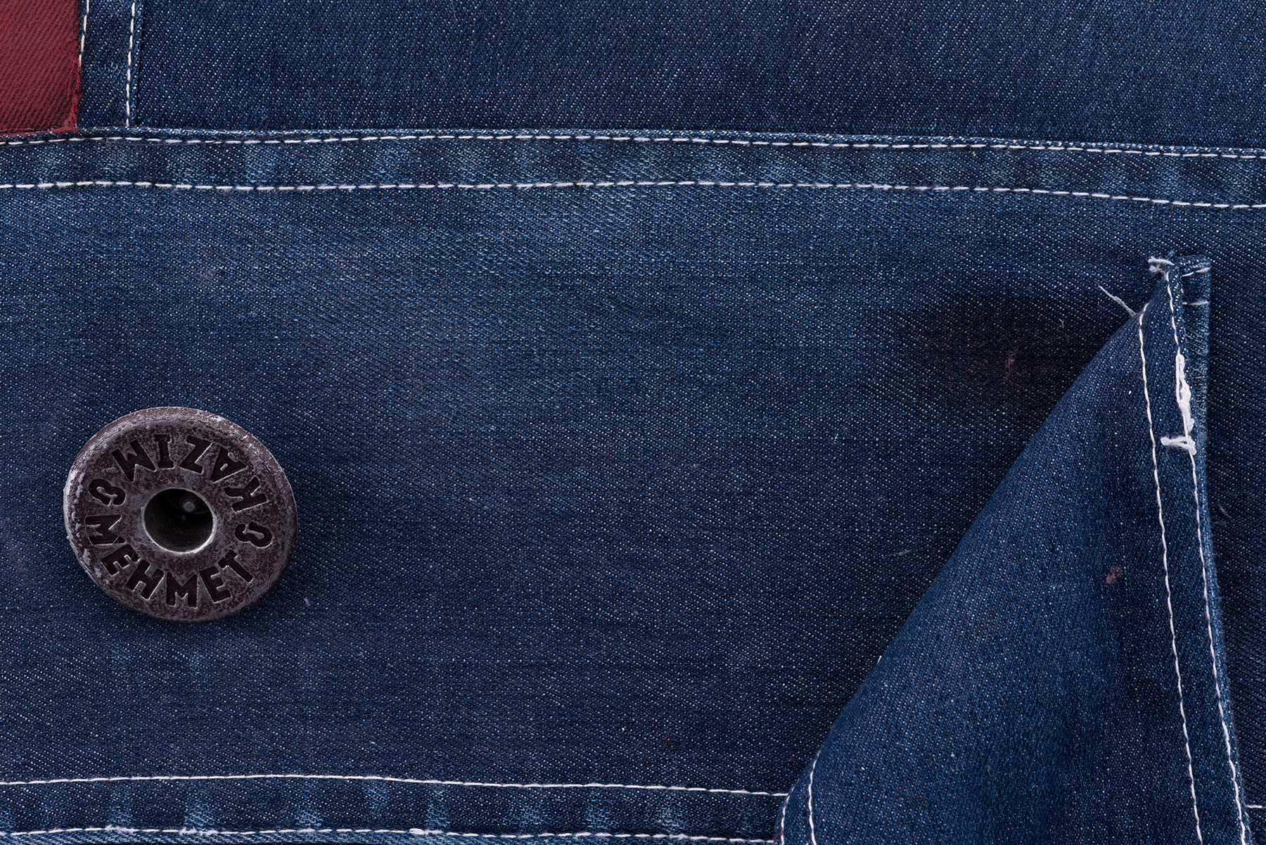 150 x 170 cm / 2018 / Oil on custom made denim combined with 3d printed buttons and rivets